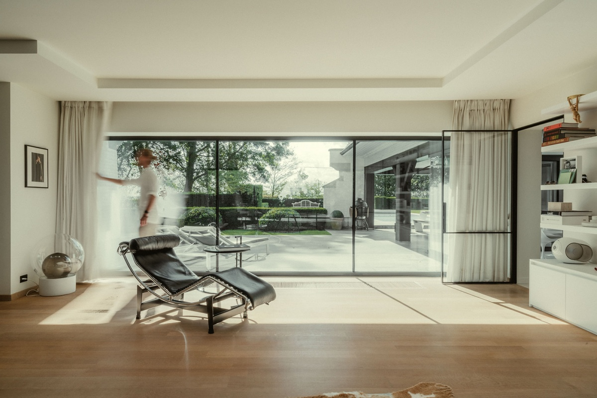 De uitdaging was om hun bestaand huis een eigentijds en lichter karakter te geven, zonder afbreuk te doen aan de authentieke uitstraling ervan. Zo koos deze klant ervoor om de leefruimte uit te breiden met een aanbouw volledig in glas om een open en licht gevoel te creëren.